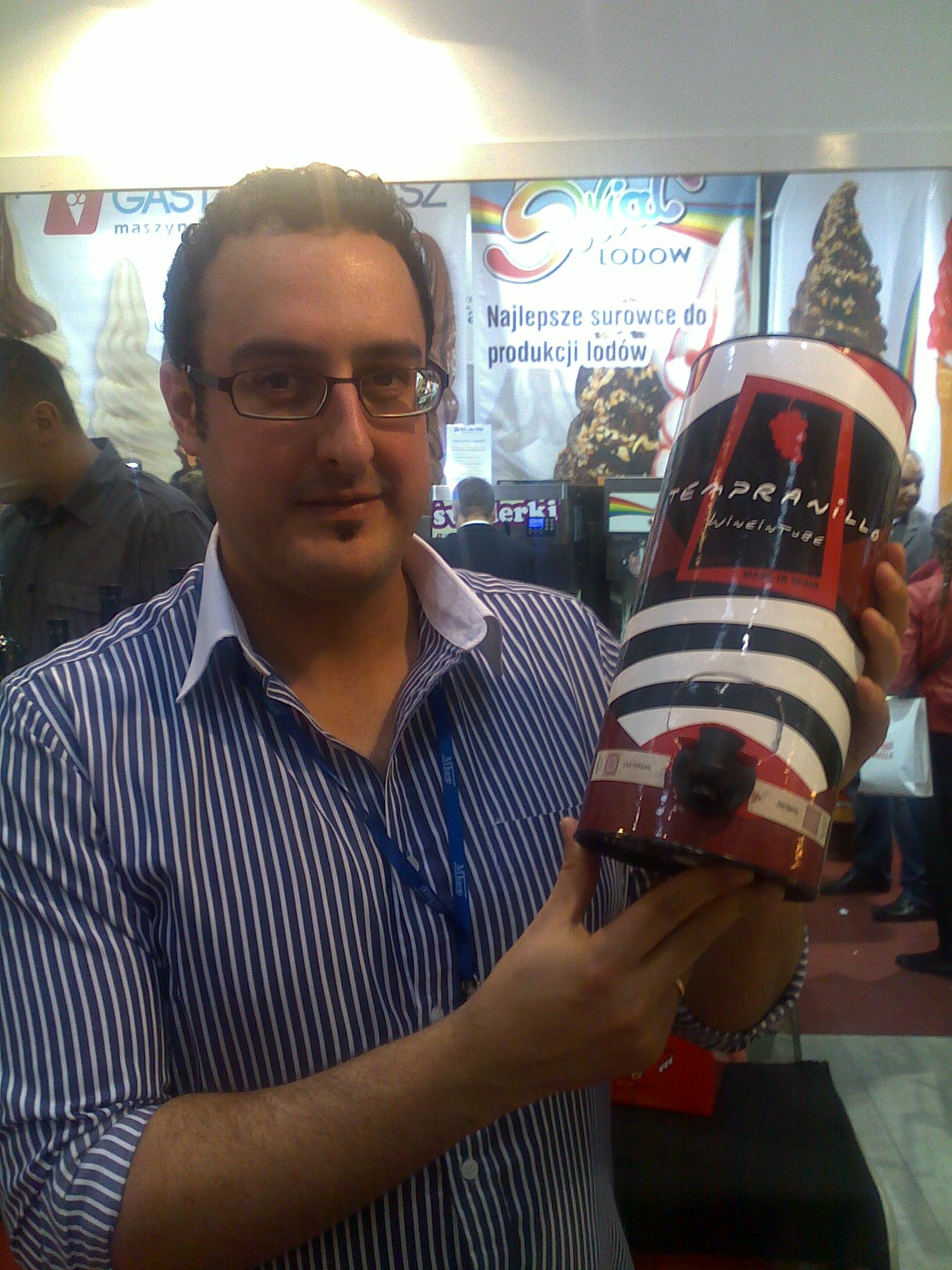 Z jaką reakcją zwiedzających spotykasz się w opinii na temat tych win? Są nowością na polskim rynku, zatem wzbudzają bardzo duże zainteresowanie na targach. Serwowane w odpowiedniej temperaturze, są naprawdę satysfakcjonujące. I widać to na tych targach, w czasie których, wiele osób próbuje i chwali je. Szczególnie przypada do gustu Merlot i Blanco. Wina są w trzylitrowych kartonach-tubach, wszystkie są winami wytrawnymi. Te sześć rodzajów wina w tubie jest czymś bardzo praktycznym - po prostu otwierasz i nalewasz, a wina z tuby nadają się do spożycia nawet trzy tygodnie po otwarciu. Cena hurtowa to około 50-60 złotych za tubę.