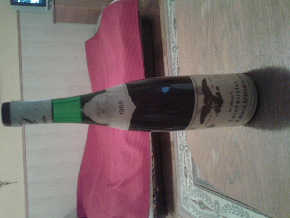 Dziwny prezent ślubny. Wino ze środkowej Mozeli, ale chyba z pospolitego szczepu, pewnie z muller-thurgau, bo gdyby z rieslinga to byłaby informacja. Poza tym wino bardzo stare, producent chyba nieznany, a rocznik 65 był średni albo słaby i w winie widać ubytek ze dwóch centymetrów szyjce.