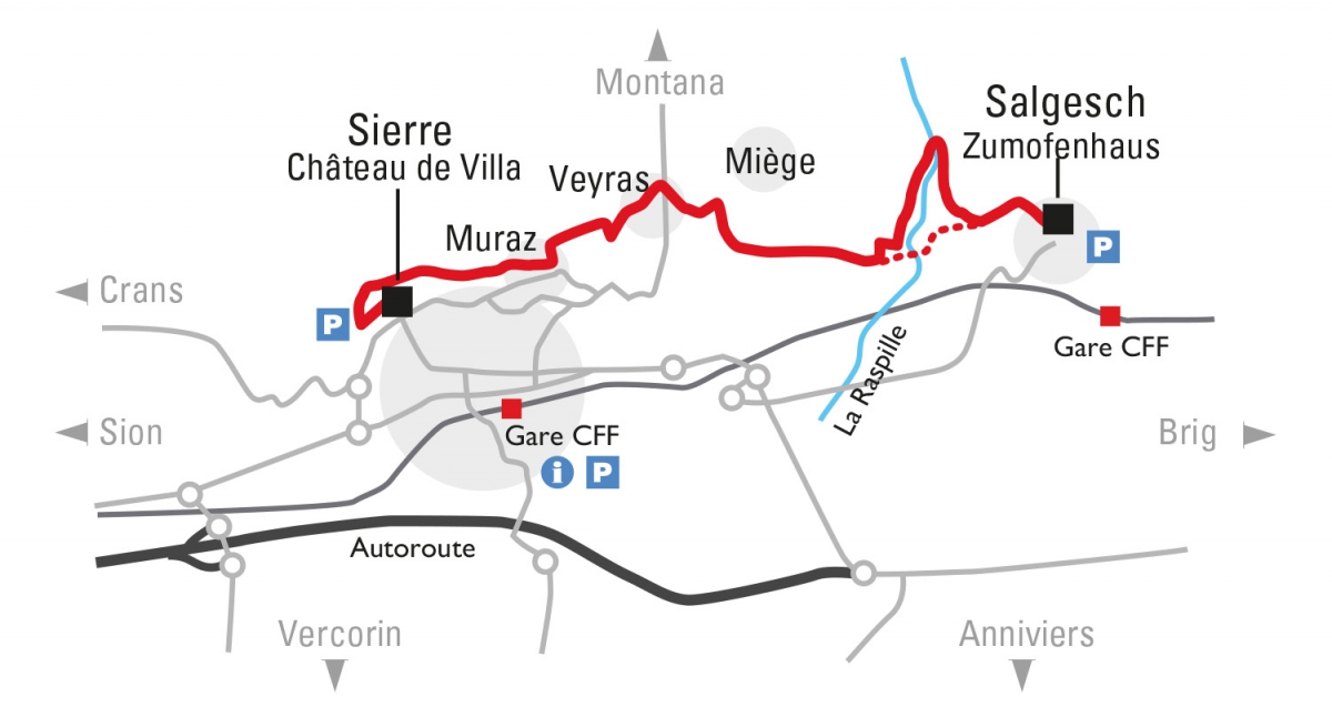 o długości 66 km ciągnąca się na wysokości 450 do 800 metrów n.p.m. od Martigny (świetne muzea, szczególnie bardzo starych samochodów) aż do Leuk. My nie mieliśmy tyle czasu, żeby przejść ją całą ale wykorzystaliśmy najciekawszy chyba jej odcinek od Sierre do Salgesch. Polecamy tę wycieczkę wszystkim. Daje ona możliwość obejrzenia sobie jak winiarze mieszkają, jak pracują w winnicach i jakie piękne mają widoki. A jeśli ten spacer połączyć jeszcze ze zwiedzeniem muzeum wina w Salgesch i