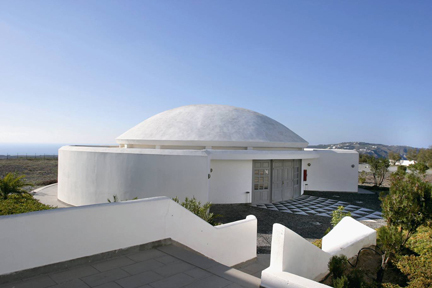 Sama budowla ma harmonijne, klasyczne proporcje. Wnętrze mieści amfiteatr i sale degustacyjne, a budynek stał się symbolem rozkwitającego przemysłu winiarskiego wyspy. Kształt, proporcje i białe mury pozwalają na utrzymanie niskiej temperatury wewnątrz. Santorini to najwyższe wystające ponad wodę piętro wielkiego podwodnego wulkanu, który u podstawy ma średnicę 20 kilometrów, a kopuła podejrzanie przypomina turecki grill. Z góry – wielkie białe jajo. Sugestywne w tym kontekście.