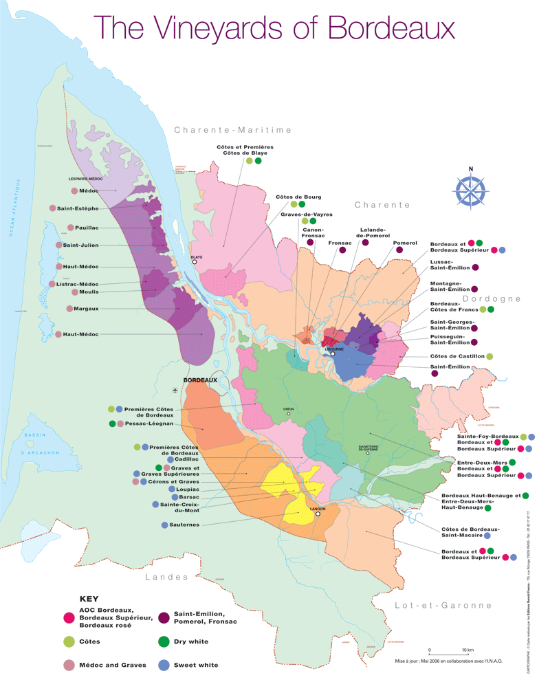 W ramach całego regionu Bordeaux możemy wyróżnić podregiony - appelations, z których każdy posiada specyficzne dla siebie zasady winobrania, wytwarzania i dojrzewania wina, a także własną klasyfikację rankingową (A.O.C.) Na przykład dla obszaru Médoc i Haut-Médoc klasyfikacja "Grand Crus Classés" określona została już w 1855 roku.