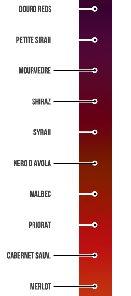 Czerwone wina z Douro Lokalne odmiany winogron z regionu Douro, smak świeżych jagód i fiołków charakterystyczny dla Touriga Franca i Touriga Nacional. Petite Sirah W naturalnym połączeniu Syrah i ezoterycznej francuskiej odmiany Peloursin przeważają wysokie taniny i czarna porzeczka. Mourvedre Mięsiste i czarne, popularne wśród najbardziej hardcorowych miłośników wina. Shiraz Australijski sukces marketingowy późnych lat osiemdziesiątych, które wino w dużej mierze zawdzięcza słodkiej nucie tytoniu w końcówce. Syrah Smak czarnych oliwek i ciasta Red Velvet; pierwszy łyk Syrah jest od razu mocny, mięsisty, z mrowiącą, kwasową końcówką. Nero D'Avola Cenione wino sycylijskie o smaku lukrecji, czeremchy amerykańskiej i skóry. Starzenie w dębinie sprawia, że wino nabiera głębi, staje się bujne i bogate Malbec Odmiana hodowana bardzo wysoko, co ma zwiększyć kwasowość wina. Odmiana o bardzo ciemnym soku, która starzona w dębie daje wina o smaku jagód i wanilii. Priorat Region o glebach łupkowych, kamienistych, na których rosną odmiany Grenache i Cabernet dające atramentowe wina, bardzo poszukiwane przez koneserów. Cabernet Sauvignon* Klasyczne, pełne wino rodem z Francji o smaku pieprzu, cedru i mnóstwa owoców. Merlot* Starzony w dębie amerykańskim ma dużo mocniejsze taniny i wyraźne nuty tytoniu i placka z owocami czeremchy amerykańskiej.