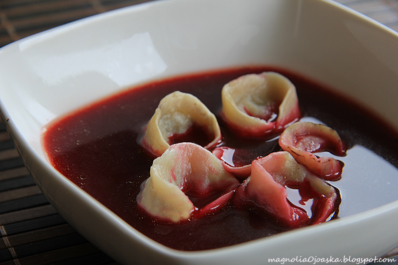Barszcz z uszkami Składniki: Barszcz: 4 kg buraków 1 główka czosnku skórka chleba razowego 3 jabłka (kwaśne) 1 cebula sól pieprz ziele angielskie majeranek 1 l wywaru jarzynowego