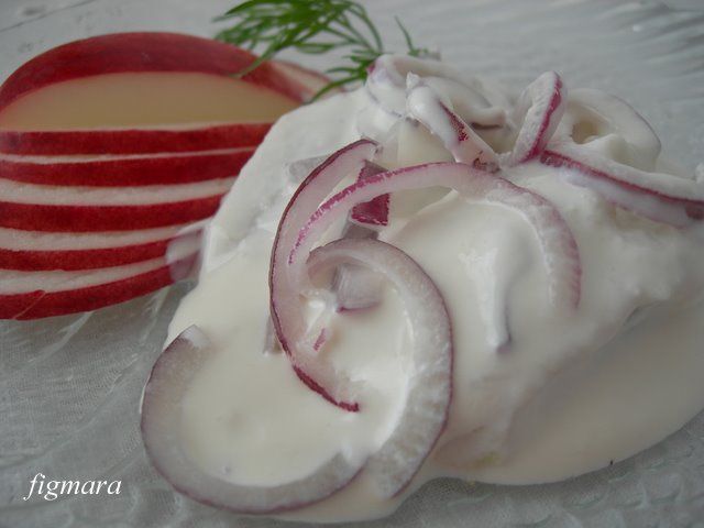 2. Śmietanę wymieszaj z cukrem, można posolić i dodać pieprz. Cebulę pokrój w piórka. Jabłko można obrać, ale niekoniecznie. Pokrój na ćwiartki, usuń gniazdo nasienne i pokrój w plastry. Wszystko wymieszaj ze śmietaną. Odstaw na 15 minut w chłodne miejsce. Jeśli śmietana jest zbyt gęsta, można dodać odrobinę słodkiej śmietanki lub mleka.