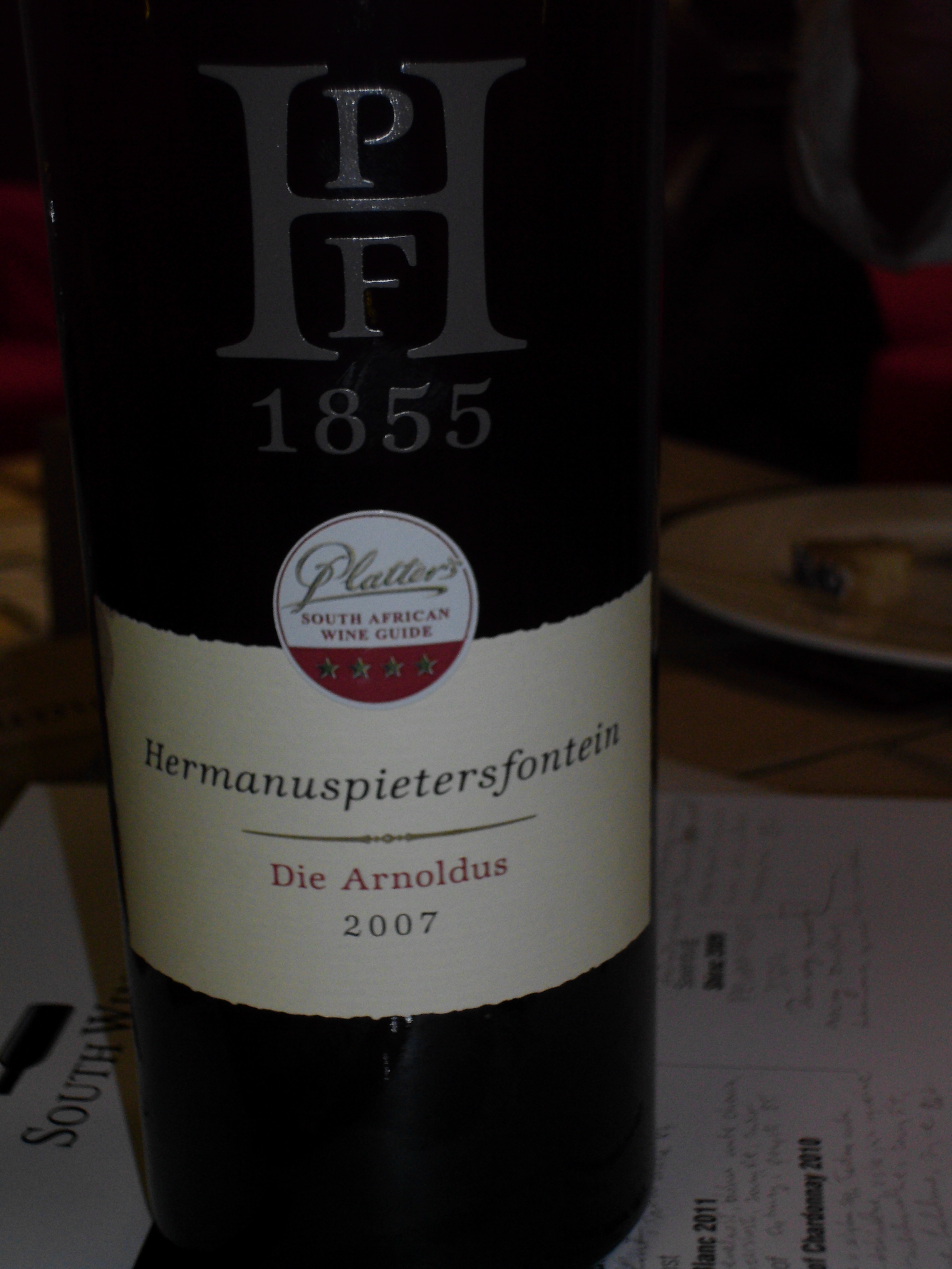 Saxenburg Shiraz 2009; sporo ciała, utrzymana harmonia pomiędzy kwasowością i słodyczą, w kieliszku niemal atramentowa czerń, zdecydowanie posiada drugie dno; do długiej dekantacji. Walker Bay jest najmłodszym regionem winiarskim RPA. Pierwsze sadzonki pojawiły się tutaj dopiero pod koniec ubiegłego wieku. Czy po tak krótkim czasie można zrobić dobre wino? Odpowiedzi szukałem w HPF1855 Die Arnoldus 2007; Pancernik okazał się dość delikatny, ale zarazem aksamitny. Podobnie jak w przypadku Caba od Murratie – nos na pograniczu tragiczności, za to świetne, pełne usta.
