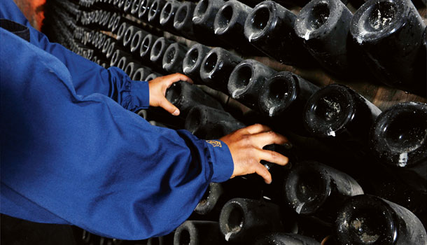 *Remuage – gdy szampan zostanie uznany za zdatny do spożycia, trzeba usunąć z butelek osad drożdży i wszelkie pozostałości, tak aby cuvée była doskonale klarowna. W tym celu przenosi się butelki na specjalny stojak (pupitre) i układa szyjką do dołu. Personel piwnic (remueurs) codziennie obraca butelki – o jedną czwartą lub jedną ósmą obrotu, raz w lewo, raz w prawo, zmieniając jednocześnie ich nachylenie. Z upływem czasu butelka zmierza do pionu, a wszelkiego rodzaju zanieczyszczenia osadzają się w szyjce. Proces ten, zwany remuage, trwa przeciętnie od jednego do trzech miesięcy. Po raz pierwszy w historii remuage zastosowano w piwnicach wdowy Clicquot (Veuve Clicquot) w 1818 r. Kiedy osad skupi się już w pobliżu szyjki butelki, butelkę zanurza się w schłodzonej solance, wskutek czego wino i osad w szyjce zamarzają. Po usunięciu korka, zamarznięta bryłka wina i osadu zastaje wypchnięta z butelki. Czynność ta określana jest jako degorgement.