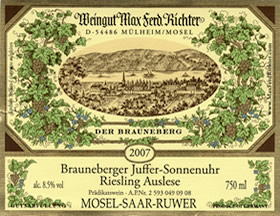 Pierwszy z nich to znakomity 2008 Mulheimer Sonnenlay Riesling Auslese (region Mosel). Wino o wspaniałym intensywnym aromacie owoców brzoskwini, jabłek fig oraz miodu. Dla mnie jest to półwytrawne wino chociaż producent twierdzi, że jest to wino wytrawne. W samku bardzo delikatne, znakomicie zbilansowane i super eleganckie. Polecam z całego serca wszystkim miłośnikom win niemieckich.