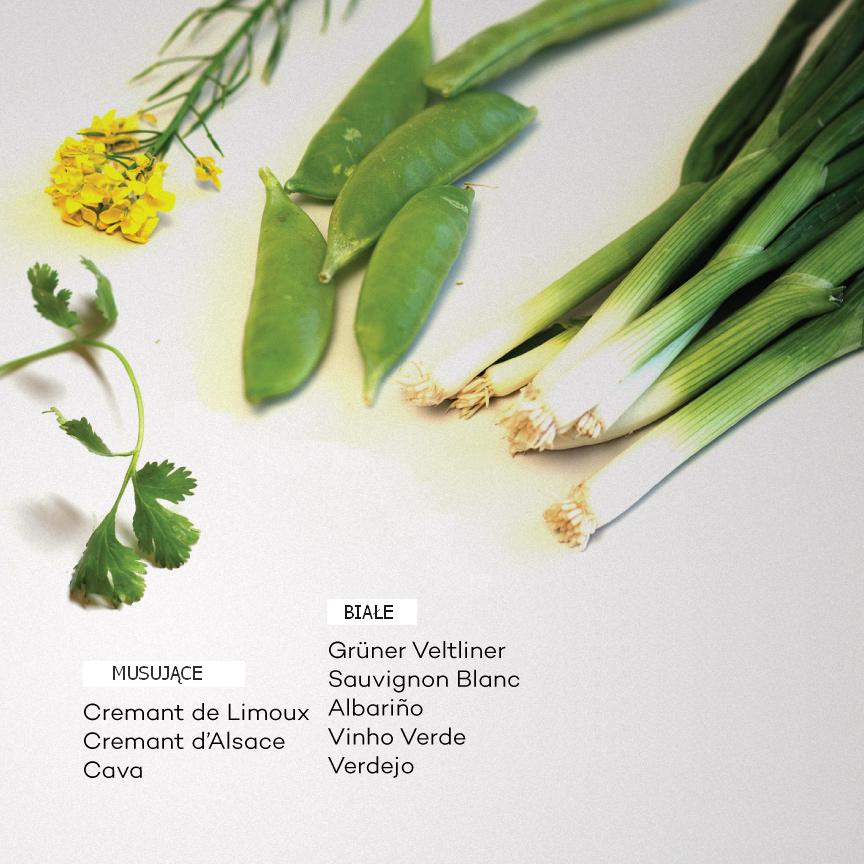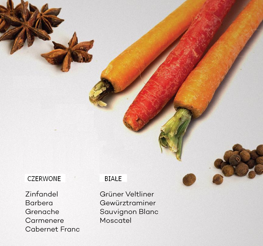 Przyprawy Warzywa korzeniowe i wina potrzebują płaszczyzny porozumienia. Gdzie jej szukać? W smaku i zapachu przypraw, które dodajemy i nieodłącznych nut korzennych w winach. Wina białe: Grüner Veltliner, Gewürztraminer, Sauvignon Blanc, Moscatel Wina czerwone: Barbera, Grenache, Carmenere, Cabernet Franc, Zinfandel