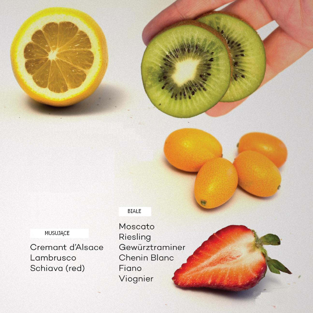 Wino powinno być słodsze Do słodkich dań dobrze jest wybrać wino, którego smaku nie zagłuszy słodycz potrawy, czyli wino słodsze. Warto o tym pamiętać zwłaszcza przy deserach. Może Moscato, Riesling albo Gewürztraminer? Kwiaty Wino o kwiatowych aromatach mają pociąg do do owoców. Dania z owocami podkreślą kwiatowe aromaty wina. Kwasowość Podobna wskazówka jak wyżej – wino powinno mieć wyższą kwasowość niż danie również w przypadku dań z owocami. Aromatyczne potrawy Różowe wina bardzo dobrze komponują się z aromatycznymi daniami z owocami. Trzeba pamiętac, by wino było tak samo intensywne jak potrawa, na przykład różowe Pinot Noir i delikatny, aromatyczny krem truskawkowy, różowe Sangiovese i dania kuchni marokańskiej. Nie należy też zapominać o Schiava. Wina musujące: Cremant d'Alsace, Lambrusco, Schiava (czerwone) Wina białe: Moscato, Riesling, Gewürztraminer, Chenin Blanc, Fiano, Viogner