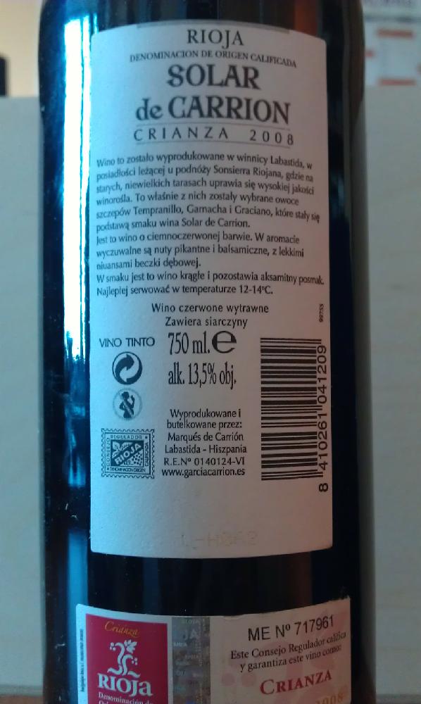 Solar de Carrion Crianza Rioja Garcia Carrion 2008