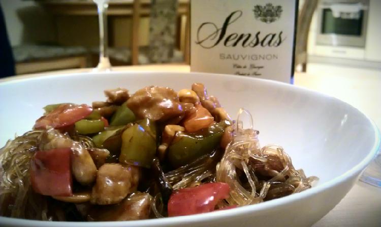 Makaron sojowy z warzywami (papryka, grzybki, marchewka), a do tego kawałki kurczaka w słodkim, ale dosyć pikantnym sosie z nerkowcami i papryką.