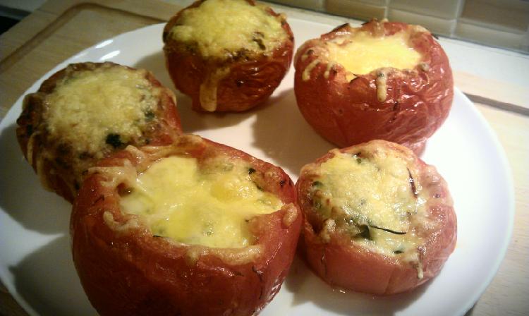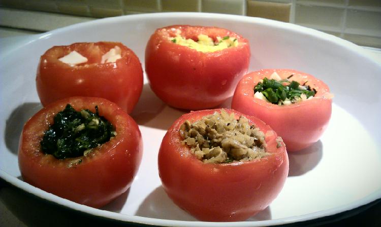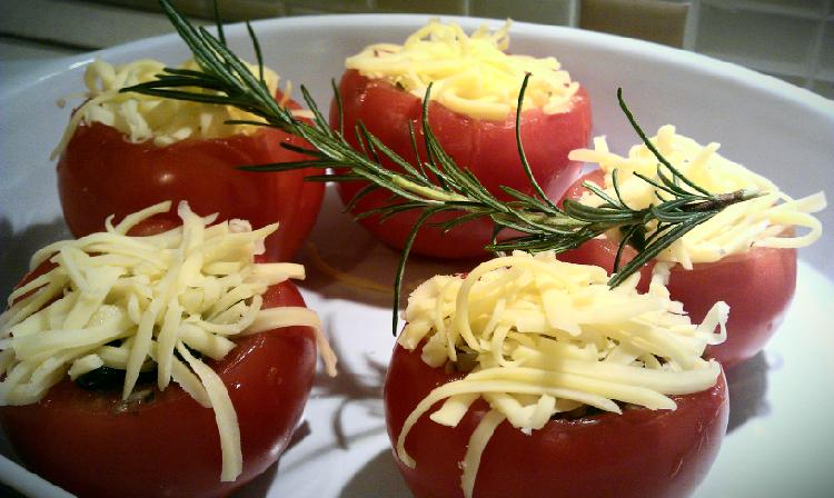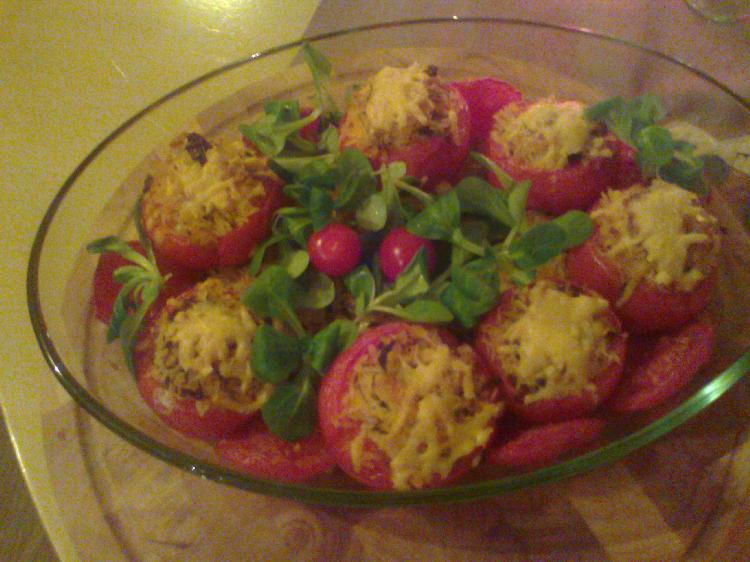 farsz - ryż, świeży tymianek, oregano, rozmaryn, suszone pomidory, ser bursztyn starty, masło, pokrojone kawałki wnętrzności pomidorowych, pieprz, sól. Na górę ser tarty i do piekarnika na 30 minut w 200 stopni