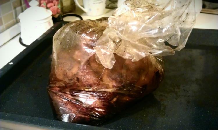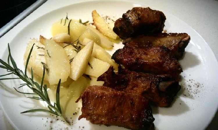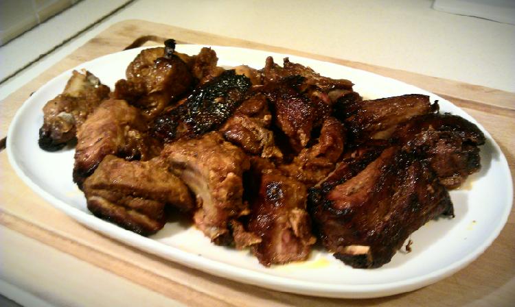 A więc. Kupujemy "pomysł na soczyste żeberka" Winiary i ładne, chude żeberka, które kroimy w cienkie paski (1 kostka). Korzystamy z przyprawy dołączonej do woreczka Winiary i wrzucamy do piekarnika (oczywiście warto to zrobić dzień wcześniej, aby mięso odrobinę przeszło przyprawą).