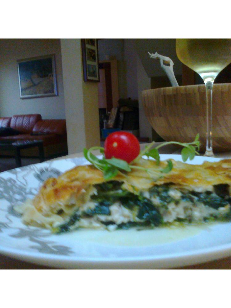 Ale mnie wzięlo:) szpinak na czosnku i oliwie przesmażony plus pieprz sól i ser kozi z kolendrą. Okoń pieprz sól i majeranek. Ciasto francuskie Blikle:). Wałkujemy ciasto szpinak, ryba, szpinak i przykrywamy ciastem. Jajo na wierzch i do piekarnika 200 stopni na ok 25-30 min. Do tego białe Gewurztraminer 2011. Uczta na dzien baby:) Jutro testuję z kurkami (zamroziłam przezornie) Jutro podejmuję 10 bab na imprezie więc będzie się działo:)