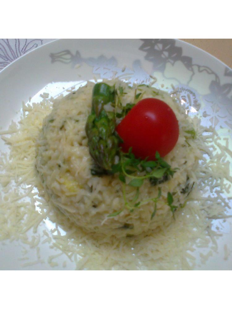Przepis: szparagi zielone pokrojone plus cukinia też pokrojona na ok 5 min na oliwie, zdjąć z patelni dodać masło na to szalotka na to ryż do risotto potem wino (szklanka) i rosołek (zrobiłam rosołek z dodatkiem szparagów) ok litra. I Tak pół godziny zabawy w dolewanie rosołku. Potem dodajemy szparagi z cukinią pieprz sól świeży tymianek i jeszcze 5 minut. No i na talerz podypać parmezanem i świeżo zmielonym pieprzem
