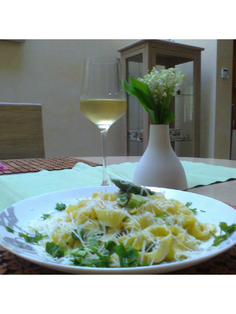 Fettuccine ze szparagami i szynką parmeńską w sosie carbonara - polecam