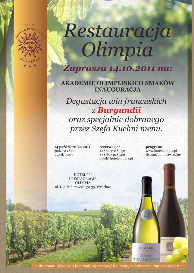 Z największą przyjemnością zapraszamy Państwa 14 października 2011 r. o godzinie 18 na degustację win francuskich z Burgundii (m. in. Pinot Noir Hautes Côtes de Beaune Vieilles Vignes Mazilly Pere& Fils, Domaine Patrick Hudelot – Hautes-Côtes de Nuits "Les Colombières"). Smak degustowanych win podkreśli specjalnie dobrane przez Szefa Kuchni Restauracji Olimpia menu.
