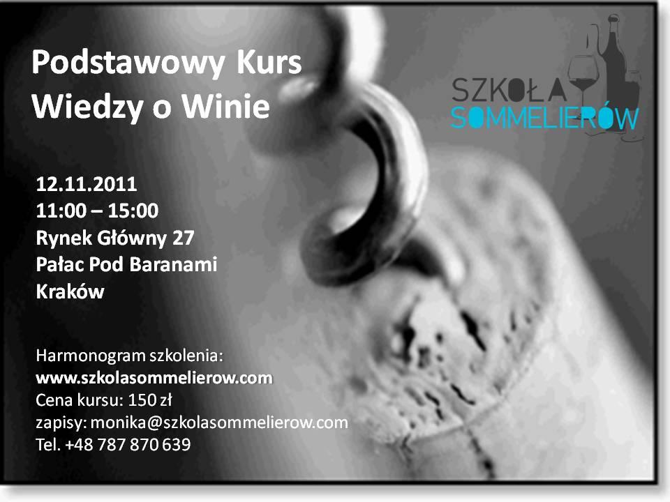 Najbliższy Kurs odbędzie się 12.11.11 w siedzibie Szkoły Sommelierów w Pałacu pod Baranami w Krakowie w godz. 11:00 - 15:00.