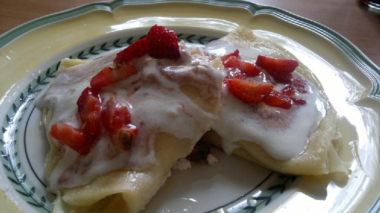 Wiosenno - letnia wersja naleśników :) "Farsz" : biały ser + twarożek waniliowy + bardzo drobno zmielone truskawki. Polać kefirem - wersja lżejsza niż ze śmietaną. Posypać cukrem i dodać małe kawałki truskawek raz jeszcze. :)