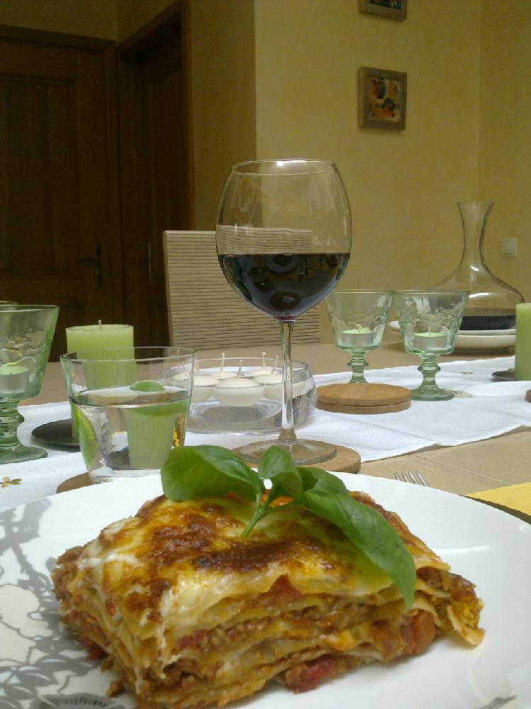 Klasyczne lasagne robię z sosem mięsnym typu bolonese (wołowina), jednak bez dodatku ziół - tylko pieprz kolorowy, sól i oczywiście czerwone wino , drugi sos biały, beszmel z gałką muszkatołową, na górze mozarella i parmezan i masełko w wiórkach. Po wyjęciu z piekarnika - kto pierwszy ten lepszy baaardzo szybko znika:)