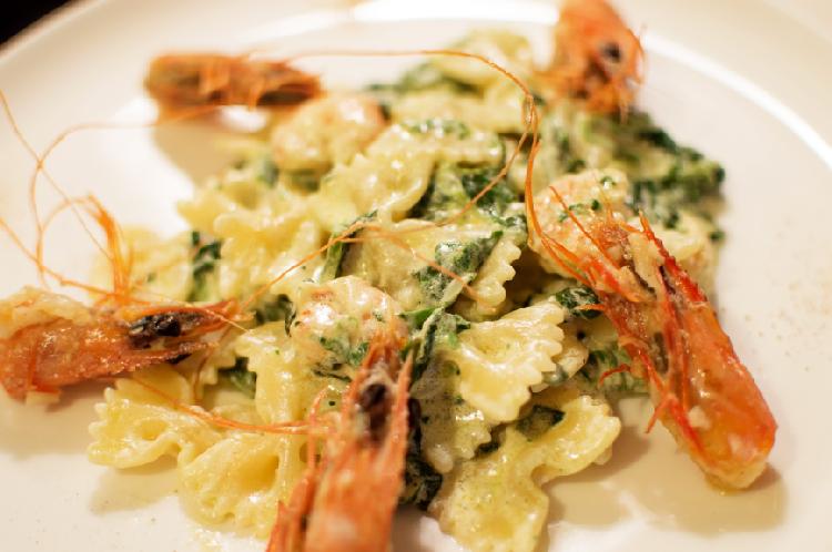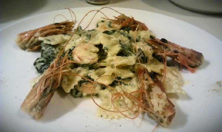 Na drugiej patelni na oliwie przesmażamy obrane krewetki (zawsze kupuję surowe/mrożone w całości, więc jest trochę zabawy) i gdy tylko zmienią kolor dorzucamy posiekany czosnek i po chwili masło.