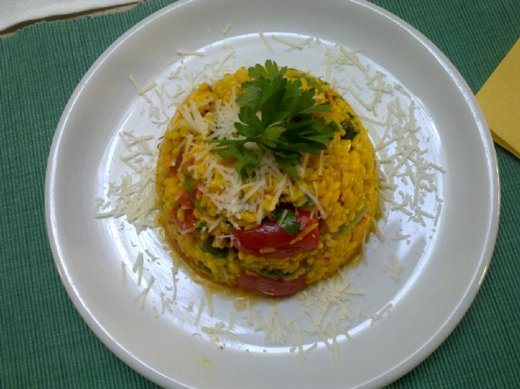 Na maśle szklimy szalotkę do tego ryż i rosół warzywny partiami - następnie szafran (suszony wcześniej moczymy w wodzie i z tą wodą wrzucamy. Do tego parmezan starty , ugotowane wcześniej (8 min) zielone szparagi pokrojone w kawałki i małe pomidorki plus zielona piertuszka pieprz i sól - i gotowe - pycha. Do tego bardzo mineralne, świeże - pełne aromatu południowych owoców, delikatne białe wino - Humberto Canale Estate Sauvignon Blanc 2011