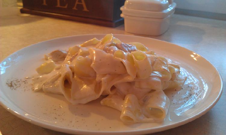 Śmietanka 18% łaciate, gorgonzola, podwójna pierś z kurczaka, papardelle, pieprz i sól.