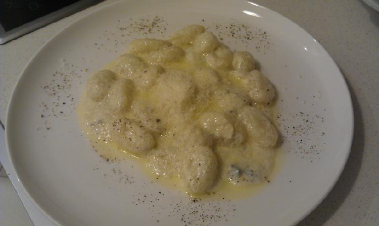 Do rondelka wlałem trochę śmietany łaciate (18%), wrzuciłem ser pleśniowy lazur (cały trójkąt) i kawałek sera brie + świeży pieprz. Na małym ogniu, a raczej na małym prądzie rozpuściłem ser i lekko zredukowałem sos. Potem ugotowałem gnocchi, wszystko wymieszałem i na talerzu posypałem grana padano.