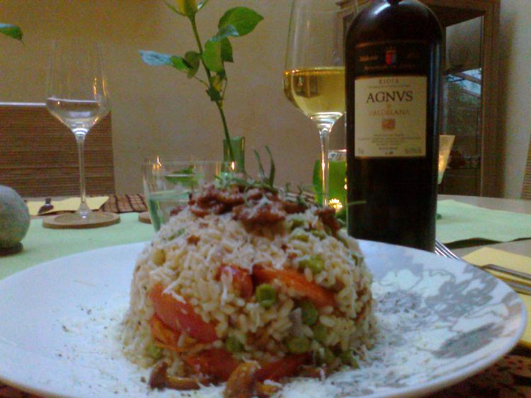 Polecam - na maśle smażymy kurki (pokrojone - połowa porcji) do tego ryż do risotto. gdy się podmaży podlewamy białym winem i gdy odparuje rosołek powoli wlewamy, świeży zielony groszek, na końcu dodajemy pomidorki koktailowe, 4 ł parmezanu i masło. Resztę kurek w całości na maśle smażymy krótko dodajemy trochę oliwy z oliwek, sól pieprz i świeży rozmaryn. Na talerz risotto na górę usmażone kurki, parmezan, świeżo zmielony pieprz - do tego białe wino - Rioja Agnvs Valdelana 2010.