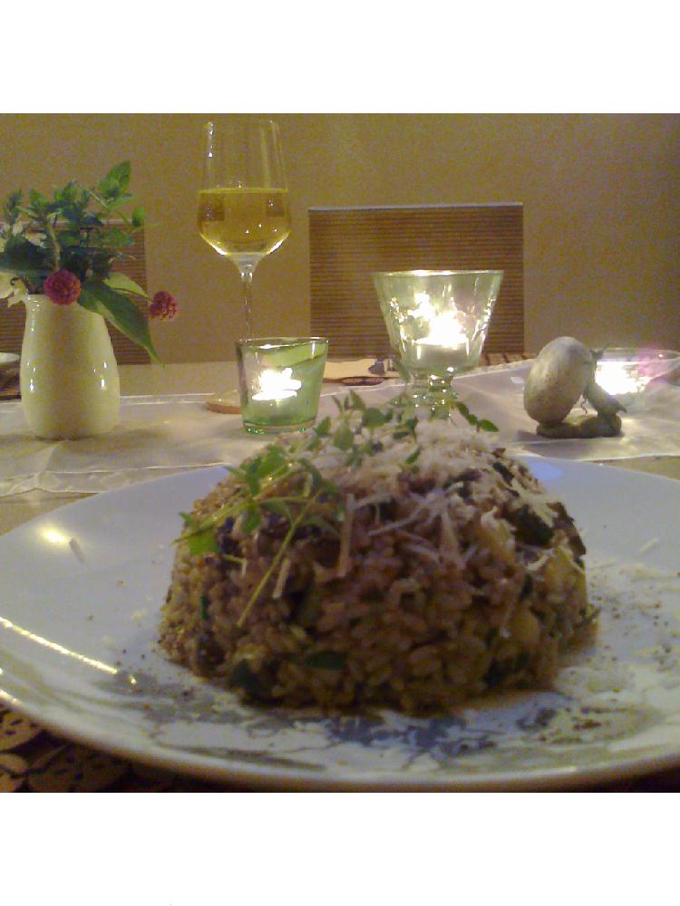 No i zrobiłam - od Pawła wzięłam cukinię, ale jednak postawiłam na risotto. Z ziółek dodałam świeży tymianek. Jak będę robić z makaronem postaram się zrobić pełną wersję Pawła. Czyli cebula, czosnek na maśle do grzybki i cukinia, potem ryż/rosół na koniec masło, pieprz, sól, parmezan no i oczywiście tymianek