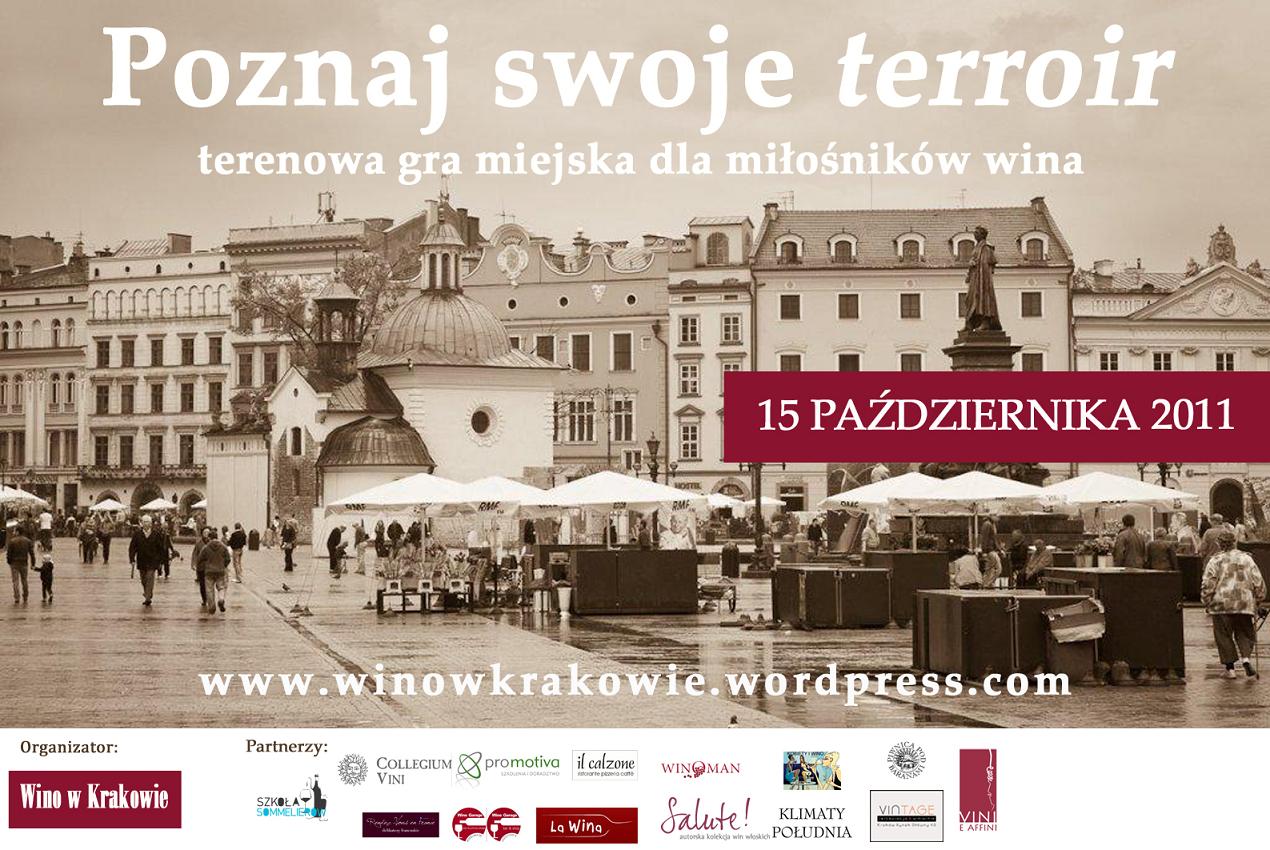 Poznaj swoje terroir to terenowa gra miejska dla miłośników wina. Francuskim słowem terroir określa się splot warunków geologicznych i klimatycznych, które nadają winu ściśle określony i niepowtarzalny charakter. W znaczeniu przenośnym, na użytek naszej gry, nazywamy tak zespół miejsc, ludzi, wydarzeń, całą tę specyficzną atmosferę, które określają przestrzeń, w której wino kupujemy, pijemy, smakujemy, omawiamy. Zapraszamy do udziału w grze miejskiej, której celem jest przybliżenie miłośnikom wina przestrzeni winiarskiej Krakowa. Pokażemy Wam przyjazne miejsca (winiarnie i sklepy specjalistyczne), gdzie zamawiający kieliszek wina czy kupujący butelkę jest mile widzianym klientem a obsługa kompetentnie doradzi. Wskażemy kilka win, które warto spróbować, nie nadwyrężając zbytnio smaku i zawartości portfela. Wszystko to w jedno popołudnie, w sobotę 15 października 2011 w rejonie Starego Miasta w Krakowie.