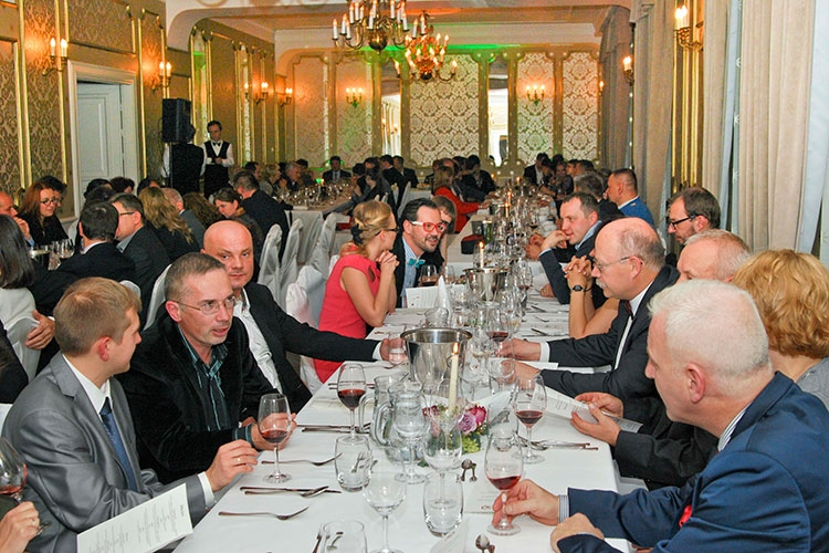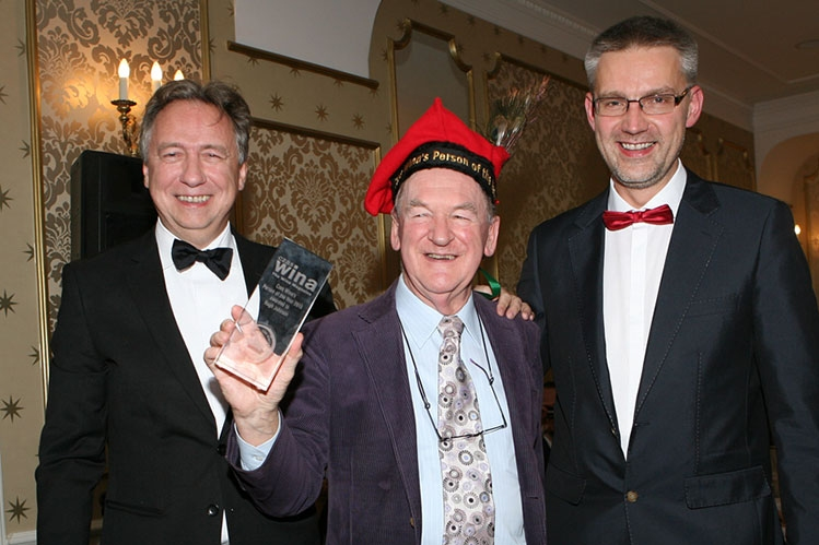 Gala poświęcona Hugh Johnsonowi z okazji wybrania go na Człowieka Roku 2013 magazynu Czas Wina. Lokalizacja w Dworze Sieraków i jego pięknych wnętrzach idealnie odpowiadała temu ważnemu wydarzeniu, bo nieczęsto zdarza się witać w Polsce tak prominentną osobistość świata winiarskiego jak Hugh Johnson. Laudację wygłosił Artur Boruta (na zdjęciu poniżej wraz z Laureatem i właścicielem Domu Wina i Dworu Sieraków Pawłem Gąsiorkiem).