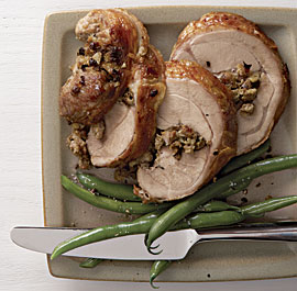 Nadzienie: 20g suszonych borowików (prawdziwków) 1 łyżka oliwy z oliwek 35dag słodkiej włoskiej kiełbasy bez osłonki 90g drobno posiekanej cebuli 2 łyżeczki zmiażdżonego czosnku 85g grubo posiekanych mrożonych serc karczocha (nie trzeba rozmrażać) 1/2 łyżeczki posiekanego świeżego tymianku 1/2 łyżeczki posiekanego rozmarynu 54g dużych okruchów wczorajszego chleba 25g świeżo startego sera Parmigiano-Reggiano sól w płatkach i świeżo mielony pieprz 1 duże jajko, delikatnie ubite
