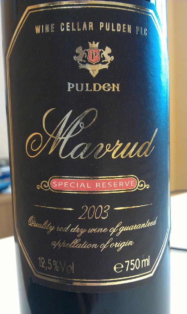 Mavrud Reserve Wine Cellar Pulden 2003 Wino w pięknym rubinowym kolorze, błyszczące. Pachnie wędzonym dymem, skórą, ale też leśnymi owocami, kilka osób wskazało również konfiturę czereśniową. W smaku czarna porzeczka, papryka. Dobra kwasowość. Długie.
