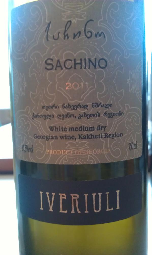 Sachino Iveriuli Tbilvino 2011 Wino o kolorze przejrzałej słomy z różowymi nutami. Bąbelki, mało klarowne. W zapachu dojrzałe papierówki z odrobiną miodu. Wyczuwalny alkohol. W smaku rześkie, jabłkowe. Wysoka kwasowość, ale zrównoważona słodyczą i goryczką. Dobrze schłodzone może służyć latem jako aperitif. Będzie pasowało do białych mięs i ryb. Ktoś powiedział, że powinno być dobre do zupy cebulowej.