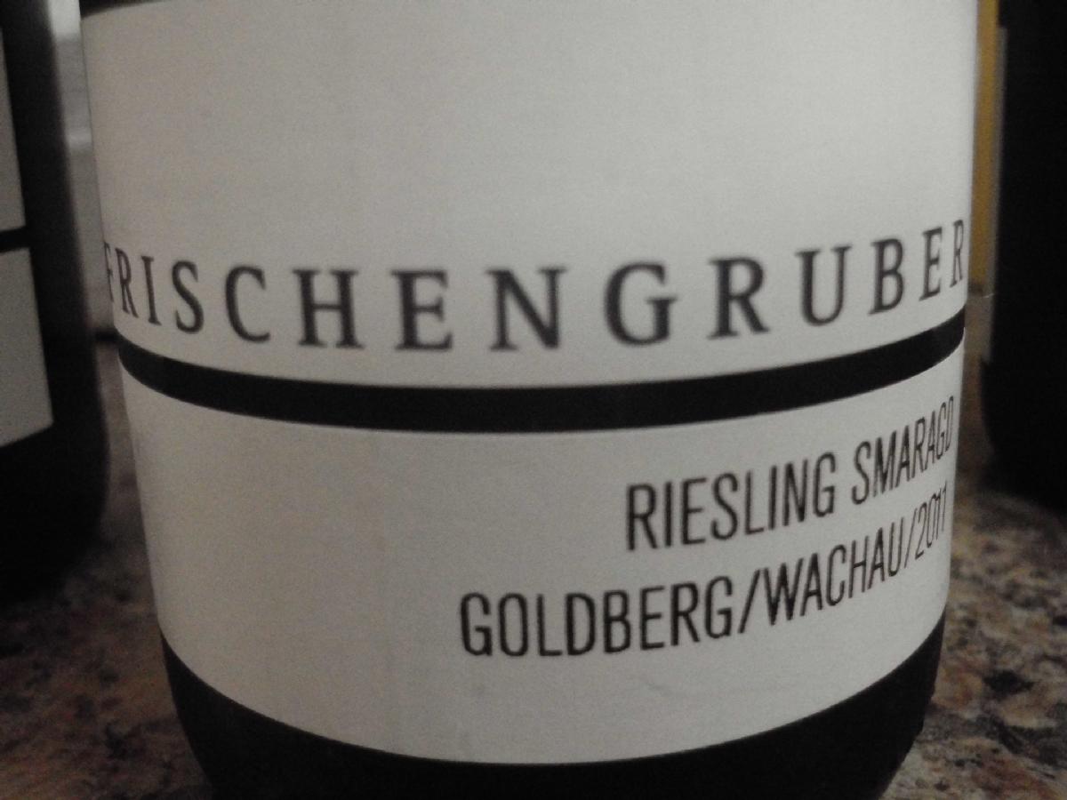 Riesling Smaragd Golderg Frischengruber Wachau 2011 - Pierwszy nos landrynkowy sztuczny. Drugi najpierw landrynkowy, dopiero po chwili aromaty melona i gruszki. Usta grejfrutowe, troche limonki, pestka.