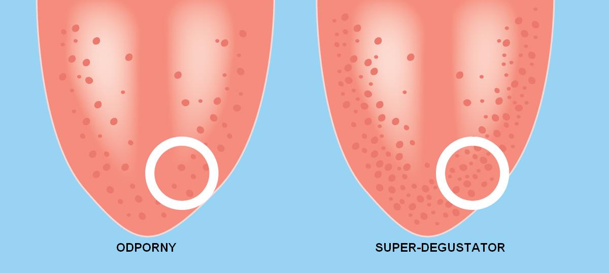 Super-degustator: 30+ kubków smakowych Wszystko smakuje bardzo intensywnie. Słone, słodkie, kwaśne, tłuste, gorzkie. Zdradza cię niechęć do gorzkich warzyw, takich jak brukselka, czy jarmuż. Mimo potęgi drzemiącej w nazwie super-degustator możesz czerpać mniej przyjemności z picia gorzkiego piwa, czy mocnego, tanicznego czerwonego wina (mając do wyboru Pinot Noir i Nebbiolo, wybierzesz to pierwsze). Skłaniać się będziesz również ku delikatniejszym potrawom, ponieważ bardzo bogate smaki mogą być dla ciebie zbyt „oleiste”. Jesteś bardzo wybredny, ale to nie musi oznaczać nic złego, wręcz przeciwnie. Linda Bartoshuk, badacz z Uniwersytetu Yale, udowodniła, że w porównaniu z odpornymi super-degustatorzy dużo rzadziej cierpią na otyłość.