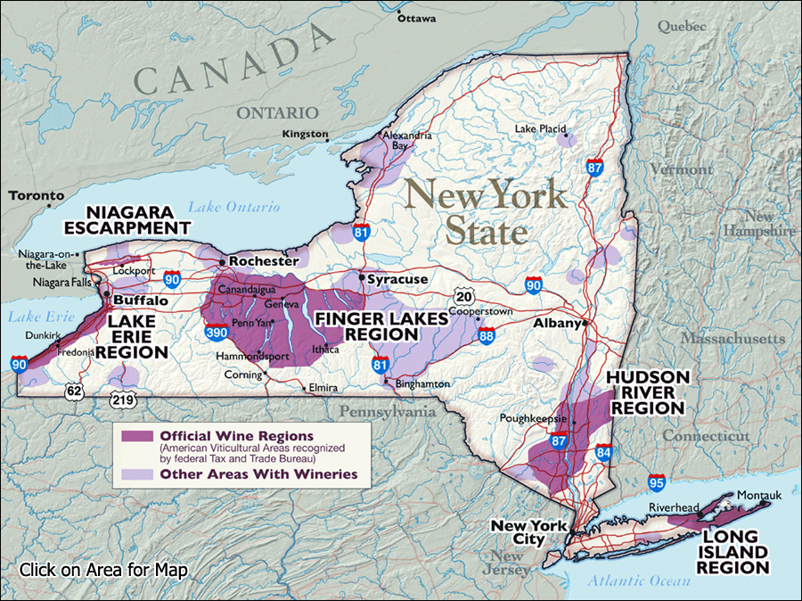 Region Nowy Jork jest trzecim największym rejonem produkcji wina w Stanach Zjednoczonych. Prawie 1 000 winnic do produkcji wina daje łącznie 150.000 ton winogron rocznie. W regionie znajduje się dziewięć apelacji AVA - jednak to trzy z nich odgrywają najważniejszą rolę. Finger Lakes z największą koncentracją produkcji wina na wschód od Kalifornii, Hudson Valley, gdzie znajduje się najwięcej winnic wytwarzających wina najwyższej klasy i Long Island, które jest nowojorskim zagłębiem win czerwonych.